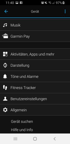 Die Taste hat noch eine weitere Funktion: Wird sie länger gedrückt, öffnet sich ein Schnellzugriffsmenü, welches in den Einstellungen auch mit bevorzugten Funktionen belegt werden kann. Allgemein ist die Menüstruktur der vivoactive 3 Music sehr übersichtlich gehalten und alle Funktionen sind schnell zugänglich.