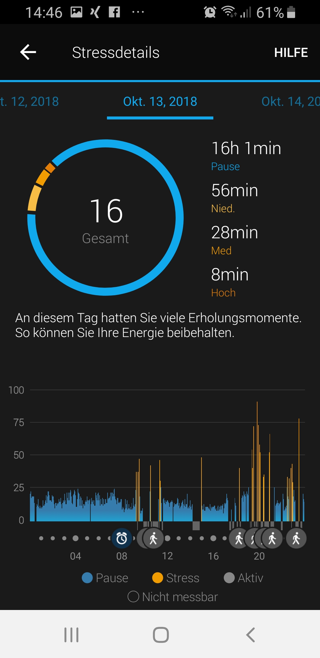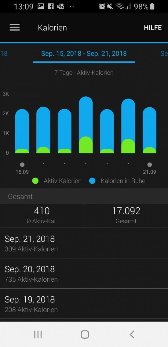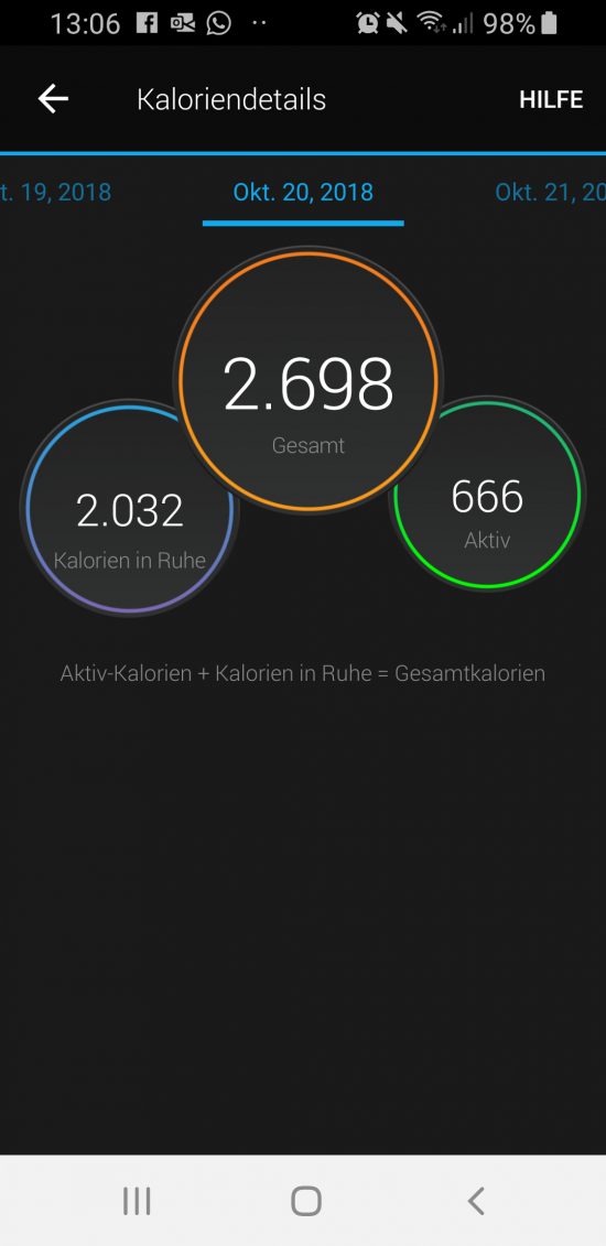 An der Kalorienberechnung hat sich im Vergleich zur vivoactive HR nichts geändert. Die Uhr zeigt mit getrennten Werten, wie viele Kalorien im Ruhezustand und durch Bewegung (Aktiv) verbraucht wurden. Die Summe aus beiden Werten ergibt den Gesamtumsatz an verbrannten Kalorien. Auf der vivoactive 3 Music selbst können die Kalorien nicht weiter im Detail ausgewertet werden. Dafür stellt die Garmin Connect App aber eine Aufschlüsslung der verbrauchten Kalorien zur Verfügung.