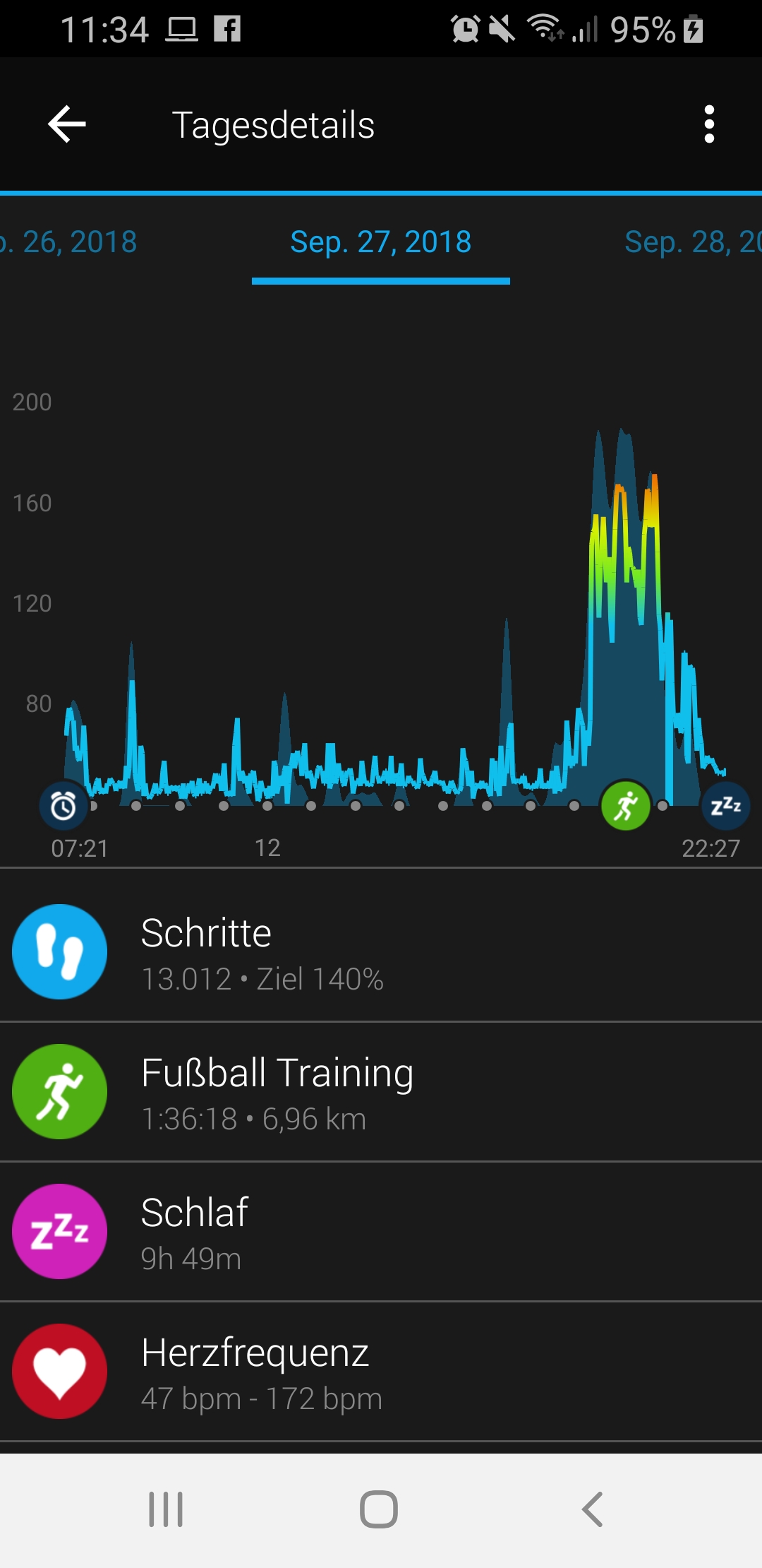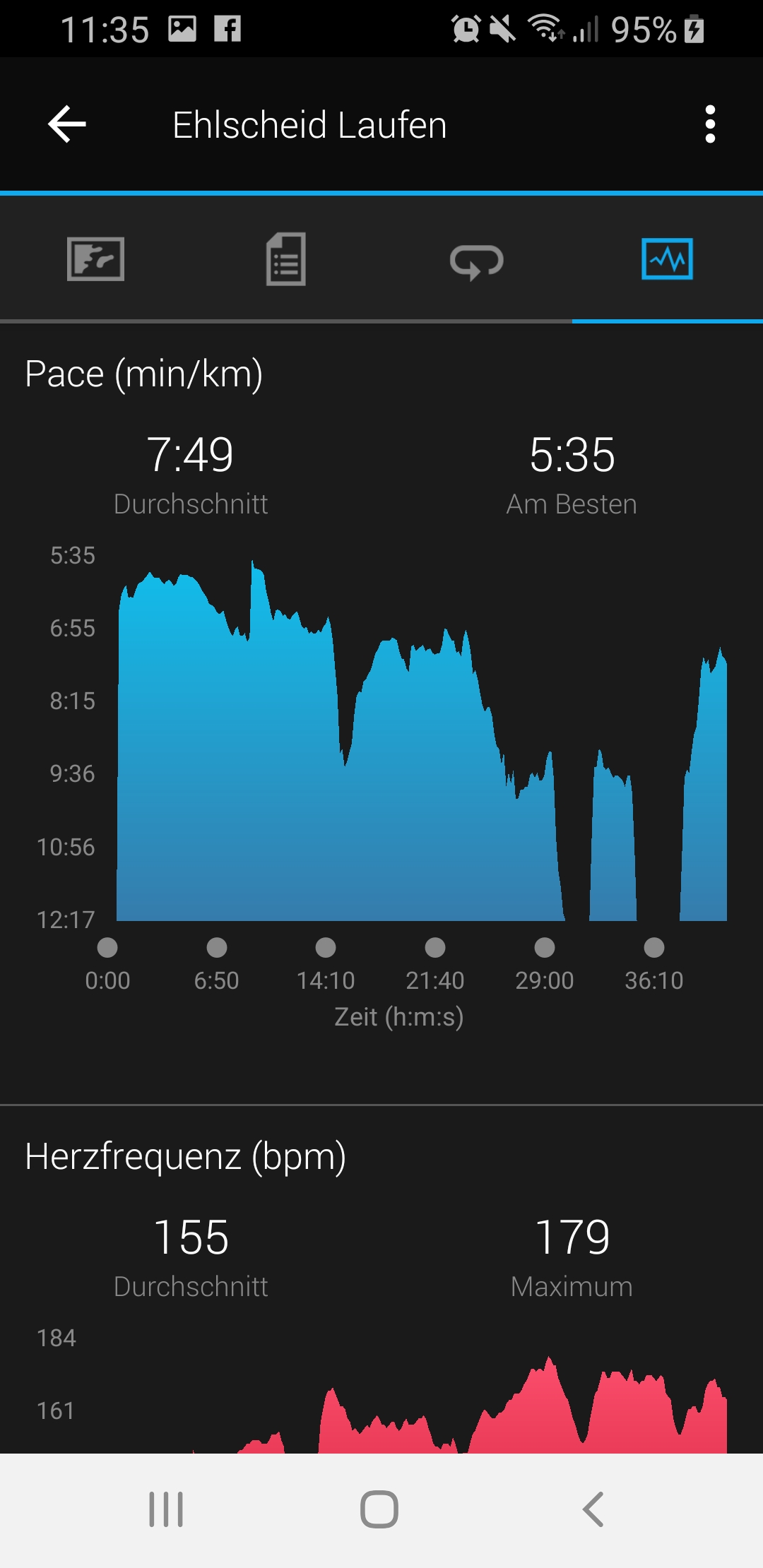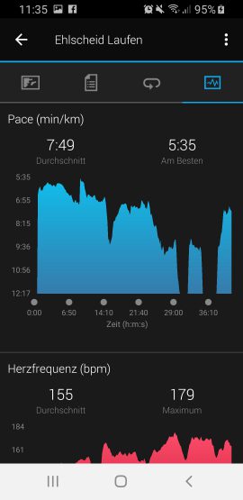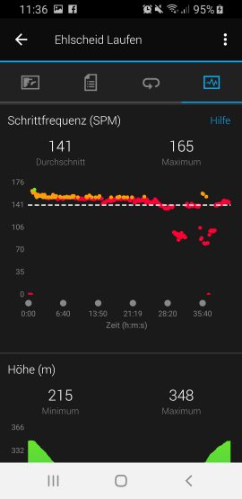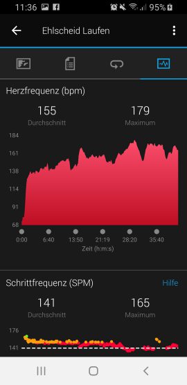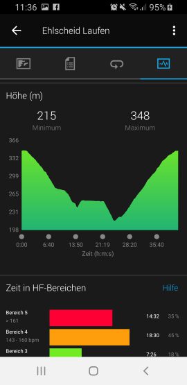 Die Auswertung der Herzfrequenzmessung spiegelte unsere Erfahrung wieder, die wir bereits mit vielen anderen optischen Herzfrequenzsensoren gemacht haben. Garmin verwendet auch bei der vivoactive 3 Music die Garmin Elevate-Technologie. Verglichen mit einem HR-Brustgurt liegen die Messergebnisse zwar sehr nah beieinander, schnelle Anstiege registriert der optische Sensor jedoch wesentlich langsamer und kann somit kurze Spitzen nicht immer exakt erfassen. Zeitlich längere Anstiege werden jedoch problemlos dargestellt.