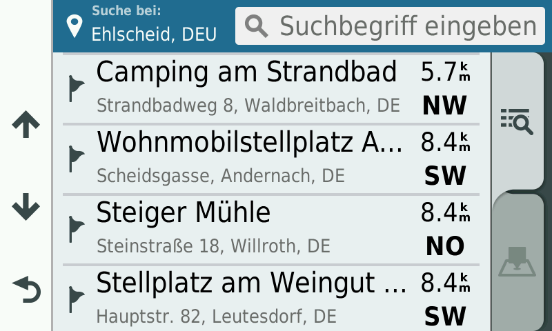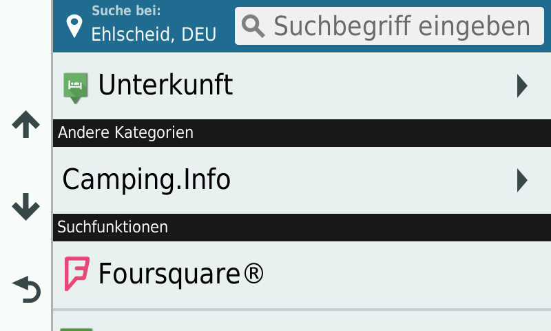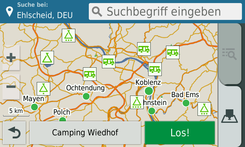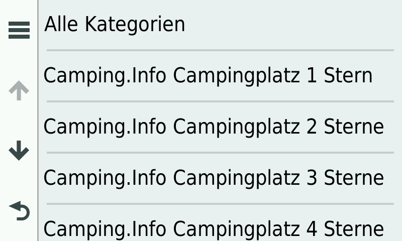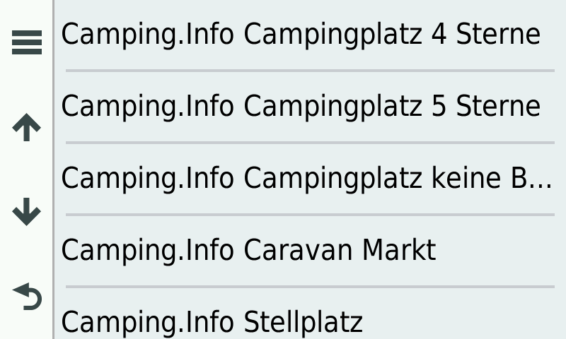 Bilder sagen mehr als 1000 Worte, daher hier eine Auswahl an Screenshots, welche den Camping.Info Camping- und Stellplatzführer mit allen einzelnen POI-Kategorien auf einem Garmin zeigen: