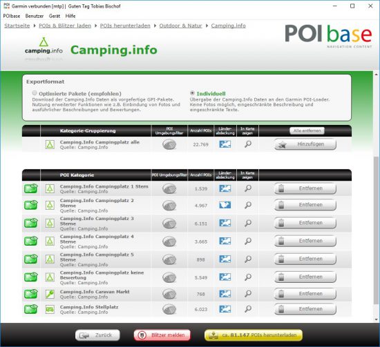 Anschließend hat man darunter die Wahl, alle POI-Kategorien gruppiert oder einzeln herunterzuladen. Bei der Gruppierung werden alle Sterne-Kategorien von Camping.info in eine POI-Kategorie zusammengefasst, wobei nur ein Icon auf der Karte erscheint. Bei der einzelnen Auswahl werden alle Sterne-Kategorien von 1 bis 5 mit verschiedenen Icons auf der Karte angezeigt.