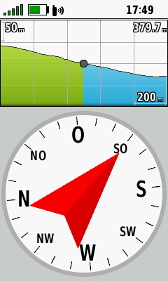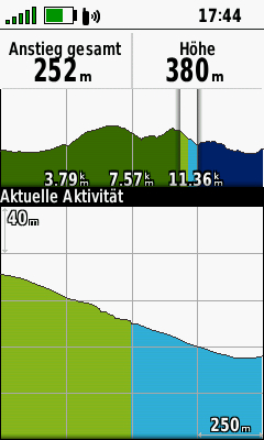 Insoweit können wir mit der Höhenmessung des GPSMAP 66i sehr zufrieden sein. Was die Darstellung des Höhenprofils betrifft (siehe unteres Bild), auch diese ist sehr gelungen und kann in unterschiedlichen Kontexten eingeblendet werden. Ist beispielsweise eine Route aktiviert, wird das Höhenprofil unterschiedlich eingefärbt, wodurch sofort ersichtlich wird, welche Streckenabschnitte und Höhendifferenzen noch zu meistern sind.