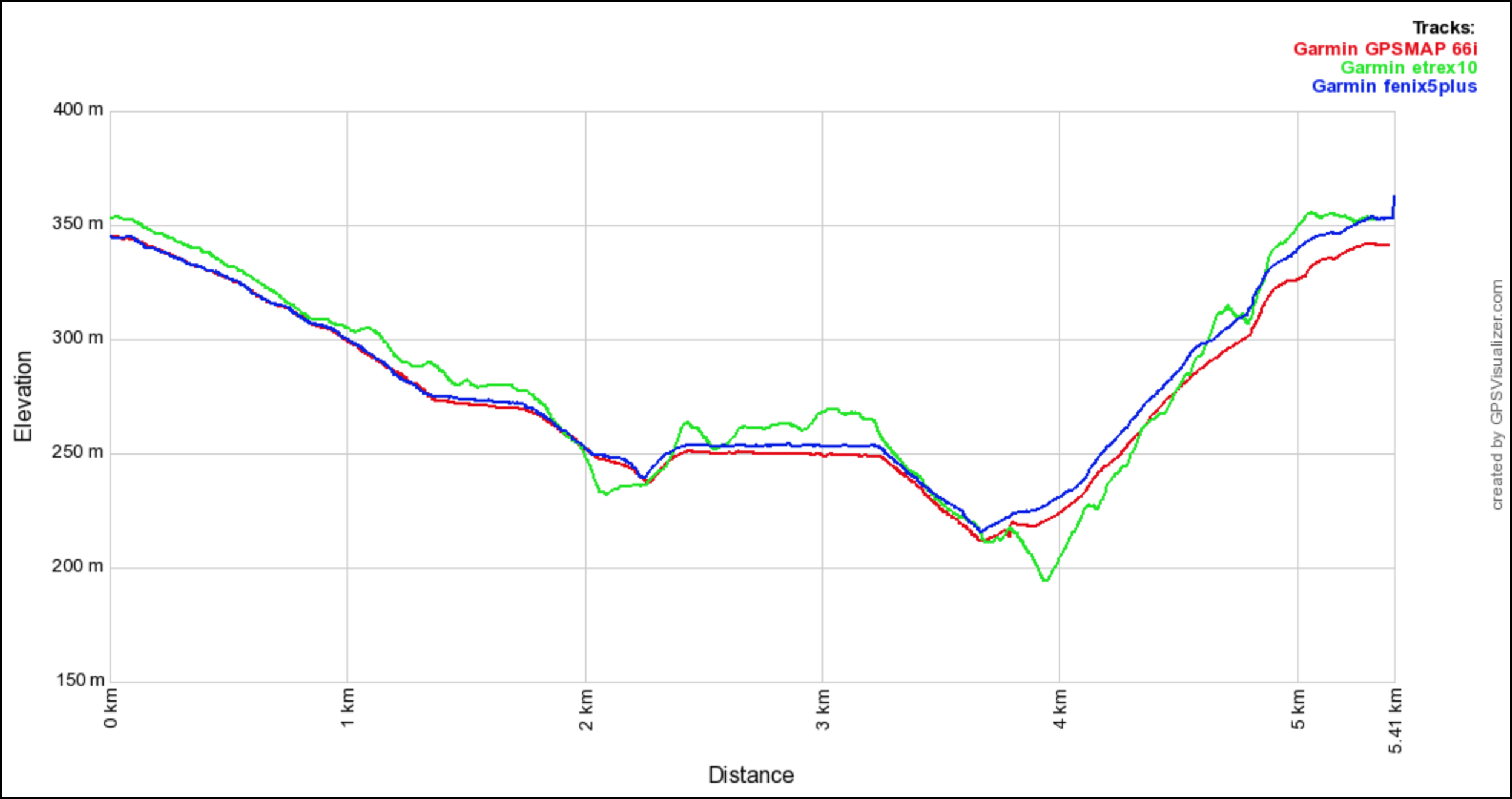 Die Ergebnisse in obiger Kurvendarstellung zeigen, dass sich die Messungen vom GPSMAP 66i und der fenix 5X erst während des letzten Kilometers unserer Testrunde anfangen, um etwa 10 Höhenmeter voneinander zu unterscheiden. Ein Vergleich zum Garmin eTrex 10 ohne integrierten barometrischen Höhenmesser zeigt hingegen, wie extrem ungenau die Werte bei GPS-basierten Höhenberechnungen ausfallen können. Folgende Aufstiegssummen konnten für die oberen drei Testgeräte ermittelt werden: