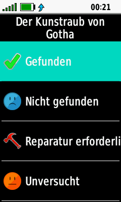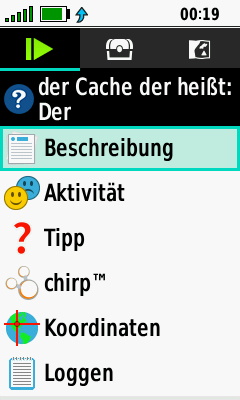 | Geocaching (paperless) | ![]() Beschreibung Loggen Field-Notes Logs Hinweise Filter Chirp Live-GeoCaching | Beschreibung Loggen Field-Notes Logs Hinweise | Beschreibung Loggen Field-Notes Logs Hinweise | ![]() Beschreibung Loggen Field-Notes Logs Hinweise Filter Chirp | ![]() Beschreibung Loggen Field-Notes Logs Hinweise Filter Chirp Live-GeoCaching | ![]() nur als Wegpunkte |