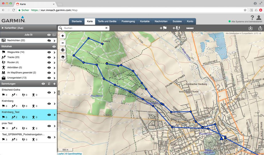 Damit man die inReach-Funktionen des Garmin GPSMAP 66i nutzen kann, bedarf es nach wie vor der Anmeldung im inReach Online-Portal. Dieses erlaubt gleichzeitig das Verwalten von Nachrichten, den eigenen Kontakten, das Speichern und Bearbeiten von Sofortnachrichten sowie Nachrichtenvorlagen und die Verwaltung von Wegpunkten, Tracks und Routen. Seit der Veröffentlichung unseres Testberichts zum inReach Explorer+ hat sich im inReach Online-Portal einiges getan. Während die Kartenansicht zum damaligen Zeitpunkt schnell unübersichtlich wurde und die bestehenden Reiter nur unbefriedigende Filteroptionen boten, können basierend auf den eigenen Daten in der Bibliothek jetzt verschiedene Sammlungen angelegt werden. Dabei kann genau festgelegt werden, welche Wegpunkte, Tracks, Routen oder Aktivitäten der Sammlung hinzugefügt werden sollen. Das ganze hilft nicht den Überblick zu verlieren, aber auch Nachrichten wesentlich einfacher gefiltert darzustellen. Insgesamt empfanden wir diesmal die Arbeit mit dem inReach Online-Portal etwas einfacher und konnten Daten wie Tracks nun leichter in der Listen- und Kartenansicht wieder auffinden.