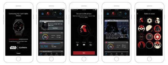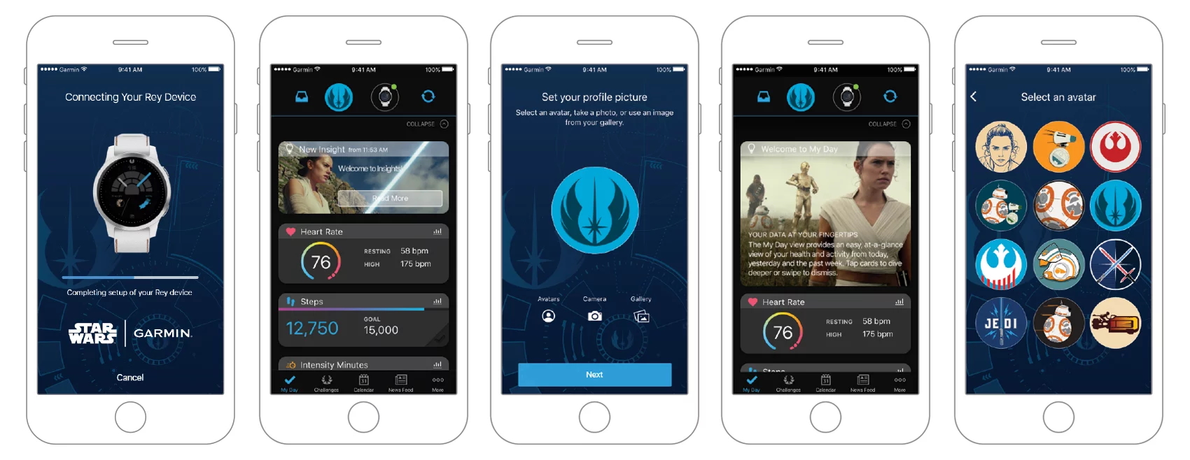 Auf Rey und Darth Vader thematisch abgestimmt sind auch die verfügbaren Watchfaces und Zielanimationen auf den Uhren sowie die Darstellung und Features der Garmin-Connect-App mit speziellen Star-Wars-Auszeichnungen, Animationen, Avataren, Insights oder Star-Wars-Logos.