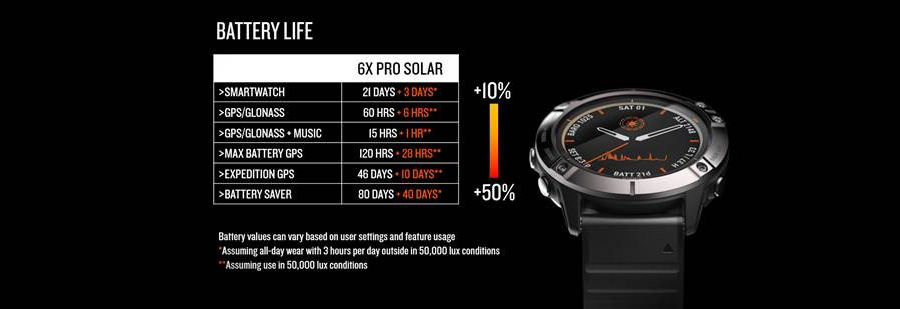 Die Solarversion der Garmin fenix 6X Pro soll nun noch mal deutlich längere Laufzeiten bieten. Das Versprechen von Garmin dazu sieht wie folgt aus: