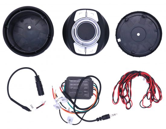 Zur Montage sind im Lieferumfang zwei Halteplatten enthalten. Die eine wurde zugleich mit doppelseitigem 3M-Klebepad sowie Montagelöchern zur Montage an einer gewünschten festen Position (rechts im Bild) ausgestattet und die andere wurde im Getränkebecherformat gefertigt, passend für einen Kfz-Getränkehalter (links im Bild). Der Dreh-Drück-Controller selbst (mittig im Bild) lässt sich aus beiden Halteschalen leicht herausdrehen, wodurch sich die Musikwiedergabe sogar außerhalb des Fahrzeugs in einer Reichweite von bis 10 Metern weiter bedienen lässt, beispielsweise beim Campen mit dem Wohnmobil.
