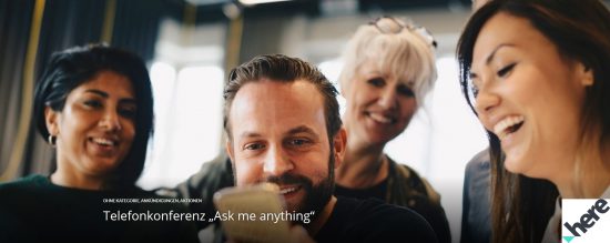 Über die Konferenz-Plattform WebEx kann man an der Telefonbesprechung teilnehmen. WebEx muss nicht installiert werden, sondern wird einfach als Web-Anwendung im Browser geöffnet und schon kann es losgehen. Dazu einfach auf den folgenden Link klicken: Here Ask-me-anything-Telefonkonferenz über WebEx. HERE empfiehlt jedem ein Headset zu nutzen, angesichts besserer Tonübertragung.