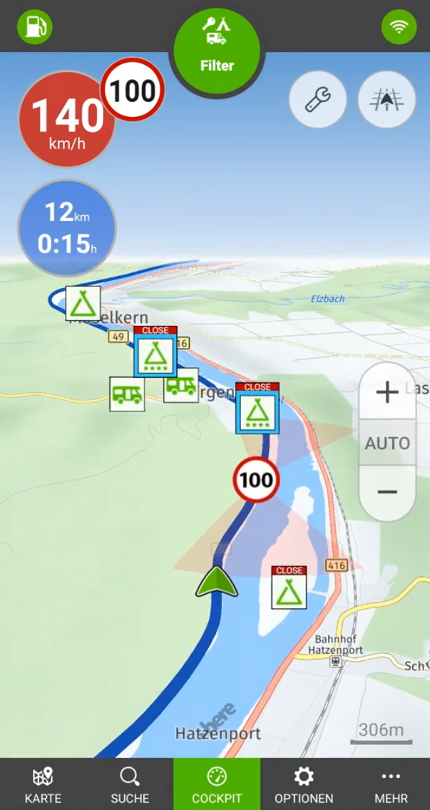Routen-, Tankpreis- und Ersparnisberechnung; Camping-Filternutzung; Camping-Details mit Bildern; Navigation und Blitzerwarner mit Camping.info by POIbase (von re nach li)