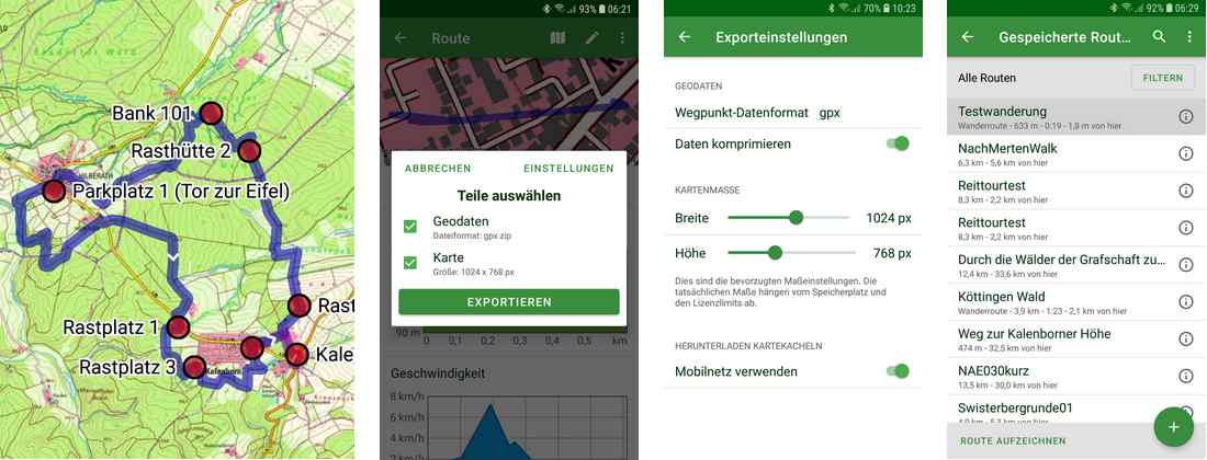 Strecken können in besonderer Art exportiert werden, nämlich nicht nur als GPX-Datei, sondern auch mit einer zugehörigen Karte. Das erleichtert die Übersicht, wo sich die Strecke befindet. Standardmäßig wird die GPX-Datei als ZIP-Archiv mitgesendet – damit ist zum Auslesen bei vielen Apps ein weiterer Schritt notwendig, andererseits können dann auch Fotos integriert werden. Datenschutztechnisch ist die App hervorragend. Sie greift nur auf Speicher und Standort des Smartphones zu und braucht keine Kontaktdaten. Einzig und allein sollte der „Akkuverbrauch im Hintergrund“ eingestellt werden, denn sonst kann eine durchgehende Aufzeichnung unterwegs nicht erfolgen.