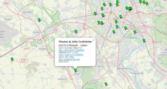 Von zuhause oder während der Radreise, Dachgeber-Nutzer können jetzt noch einfacher planen. Denn neben dem Gesamtverzeichnis als pdf-Datei erhält jedes Mitglied zusätzlich eine html-Datei, womit die Standorte der einzelnen Dachgeber übersichtlich auf einer Monitorkarte dargestellt werden können – natürlich auch unterwegs auf dem Smartphone. Klickt man auf einen der grünen Marker, erscheinen Adresse und Kontaktdaten des jeweiligen Dachgebers. Mit einem Fingertipp auf den Telefon- oder Handy-Link wird der gewünschte Gastgeber direkt erreicht.
