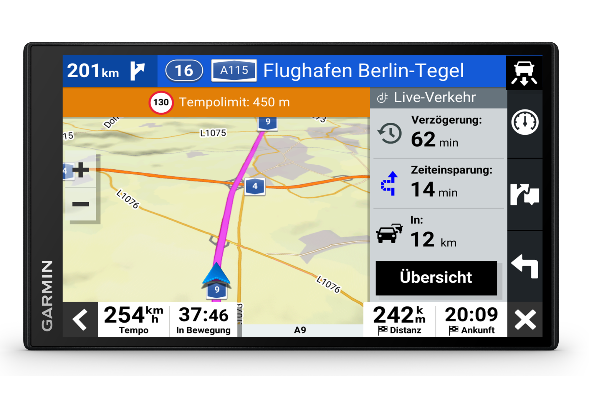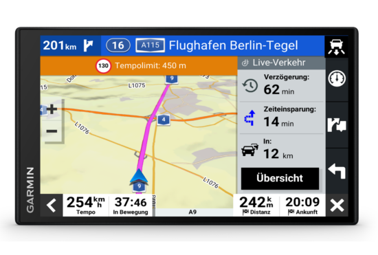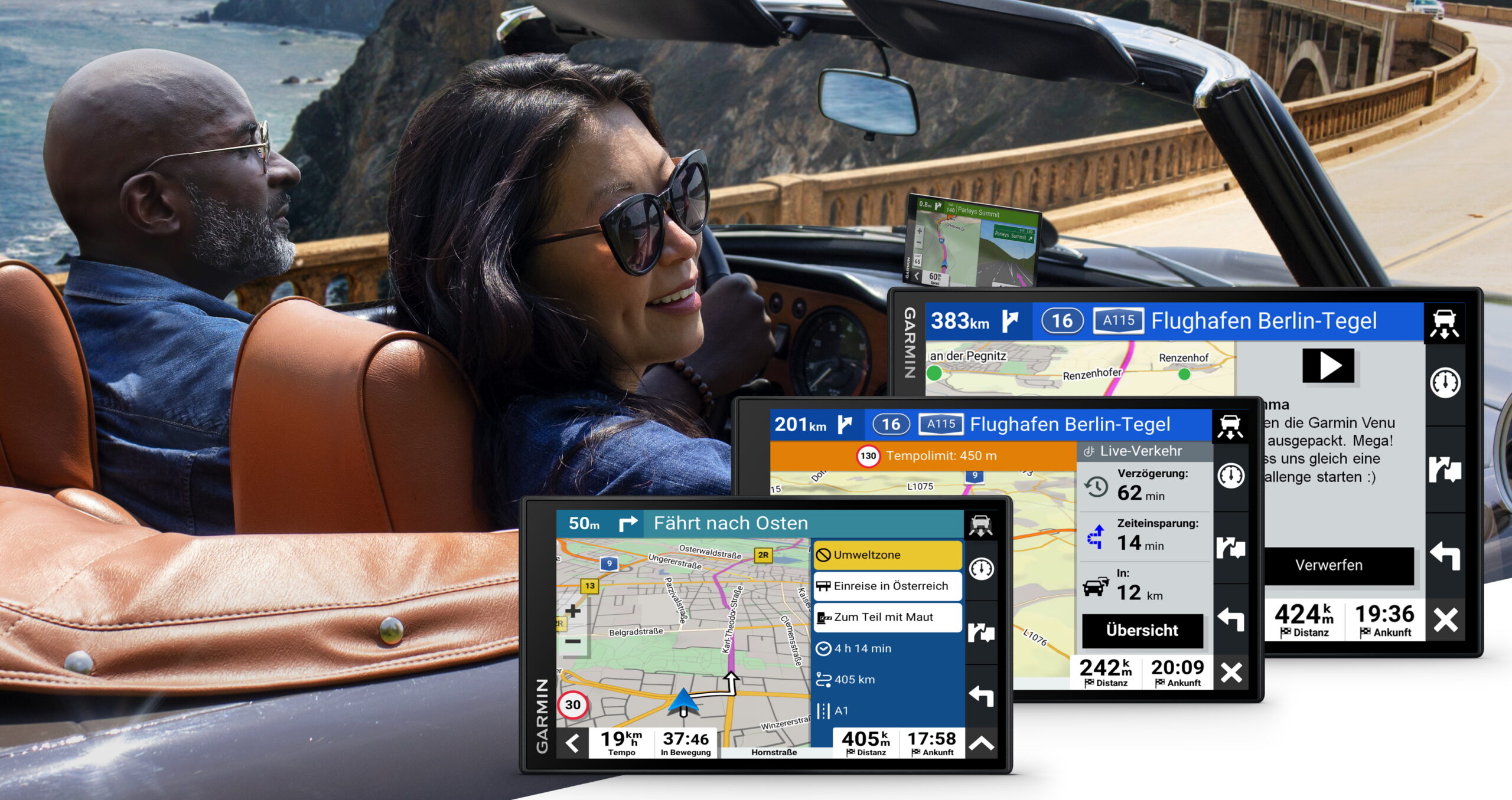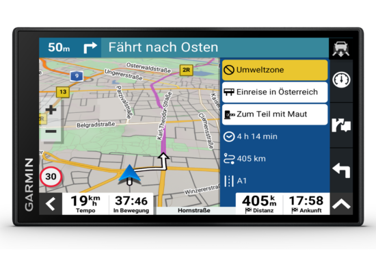 Garmins individuell konfigurierbares Fahrassistenzsystem warnt außerden, wenn sich die Geschwindigkeitsbegrenzung ändert, die zugelassene Höchstgeschwindigkeit überschritten wird oder eine scharfe Kurve und andere Gefahren im Straßenverkehr herannahen. Visuell werden Autofahrende über die altbekannten Funktionen wie Real Directions und PhotoReal Abbiegehinweise auf ihren Touren unterstützt.