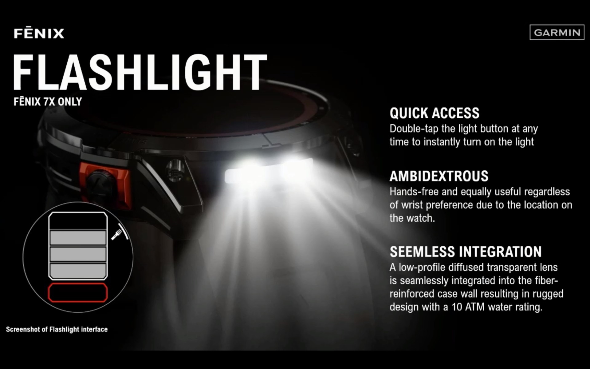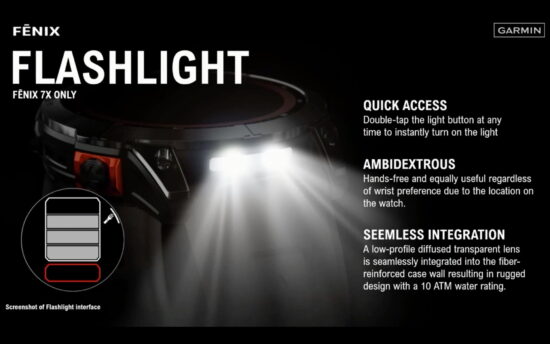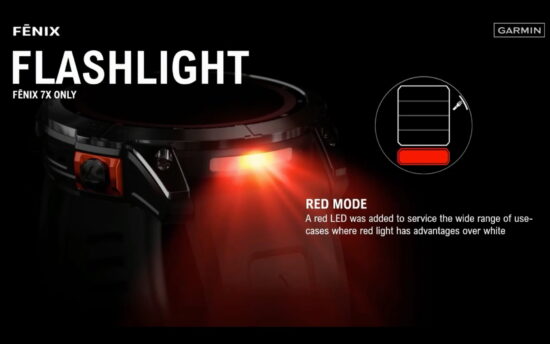 Zu guter Letzt das Taschenlampen-Thema: Nur allein die Premium-Variante fenix 7X hat ein LED-Flashlight spendiert bekommen. Ob es hell genug ist, um damit abends laufen zu können, muss sich noch zeigen. Vielleicht kann der Winter einem nun auf nächtlichen Outdoor-Wandertouren oder während des Trainings für einen Wettkampf zumindest zeitlich keinen Strich mehr durch die Rechnung machen. Die LED-Leuchte strahlt in zwei Farben während des Joggens: Weiß, wenn die Uhr nach vorne schwingt und Rot, wenn die Uhr nach hinten schwingt. Das rote Licht ist dazu gedacht, von anderen, die sich von hinten nähern, gut gesehen zu werden, ohne sie dabei zu blenden. Das Konzept scheint ausgeklügelt, wie gut es in der Praxis läuft, wird unser baliger Test zeigen.