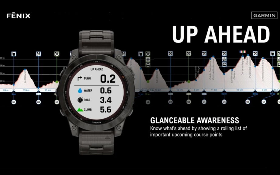 An Wettkampftagen können sich Athleten mit der Navigationsfunktion Up Ahead unterstützen lassen. Diese Funktion zeigt auf der Karte Positionen von Versorgungsstationen, Trails, Kurven, aber auch zuvor durch den Nutzer definierte Punkte mit den zuletzt gemessenen Leistungsdaten sowie eine Zusammenfassung des letzten Splits.