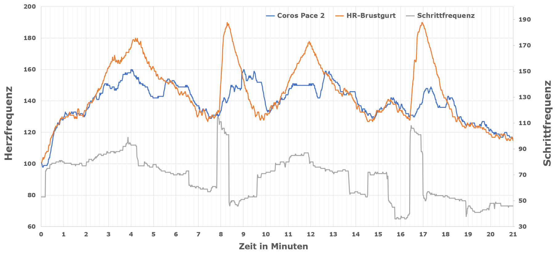 Zunächst sieht man bei beiden Uhren, dass die für optische Sensoren typische zeitliche Verzögerung von mindestens 30 Sekunden klar zu erkennen ist. Typisch ist auch, dass bei Belastungsspitzen nicht die maximale Herzfrequenz erreicht wird. Ein langsamer Anstieg der HR-Frequenz wird von der Garmin-Uhr hingegen gut abgebildet. Vor allem bei der zweiten langsamen Steigerung (Minute 11-13), wo der Körper entsprechend aufgewärmt ist, weichen die Messungen nur noch unwesentlich vom Brustgurt ab. Wer auf eine genaue Abbildung von Leistungsspitzen z. B. im Intervalltraining verzichten kann, ist mit der optischen HR-Messung der Garmin Venu 2 gut aufgehoben und kann sich einen Brustgurt durchaus sparen.