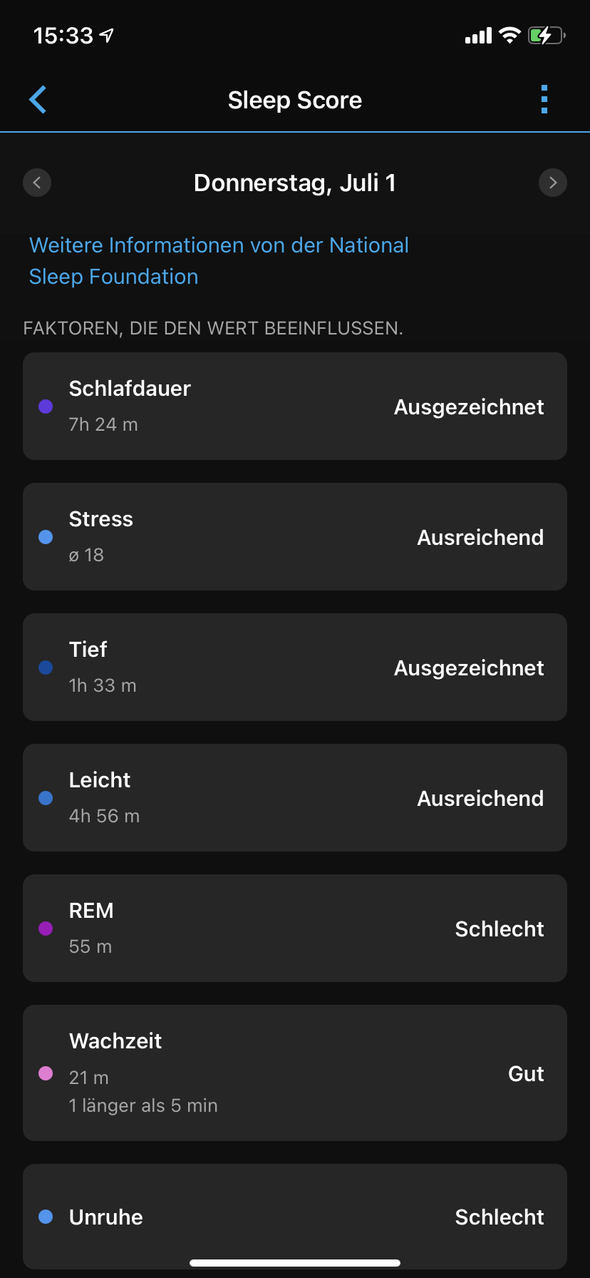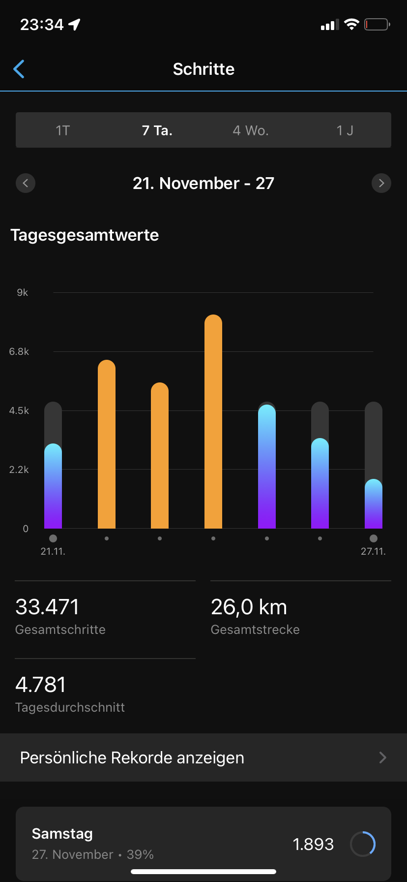 Man verscrollt sich schnell, weil Wischgesten nicht korrekt umgesetzt werden. Auffällig ist das vor allem während man in den Detailansichten zum Tag oder in der Wochenansicht für Herzfrequenz, Schritte usw. rückwärts wischt, um sich die zurückliegenden Daten der letzten Stunden anzusehen. Hier wird die Geste natürlich als Zurück-Geste erkannt und damit fliegt man ständig aus dem Menü raus.