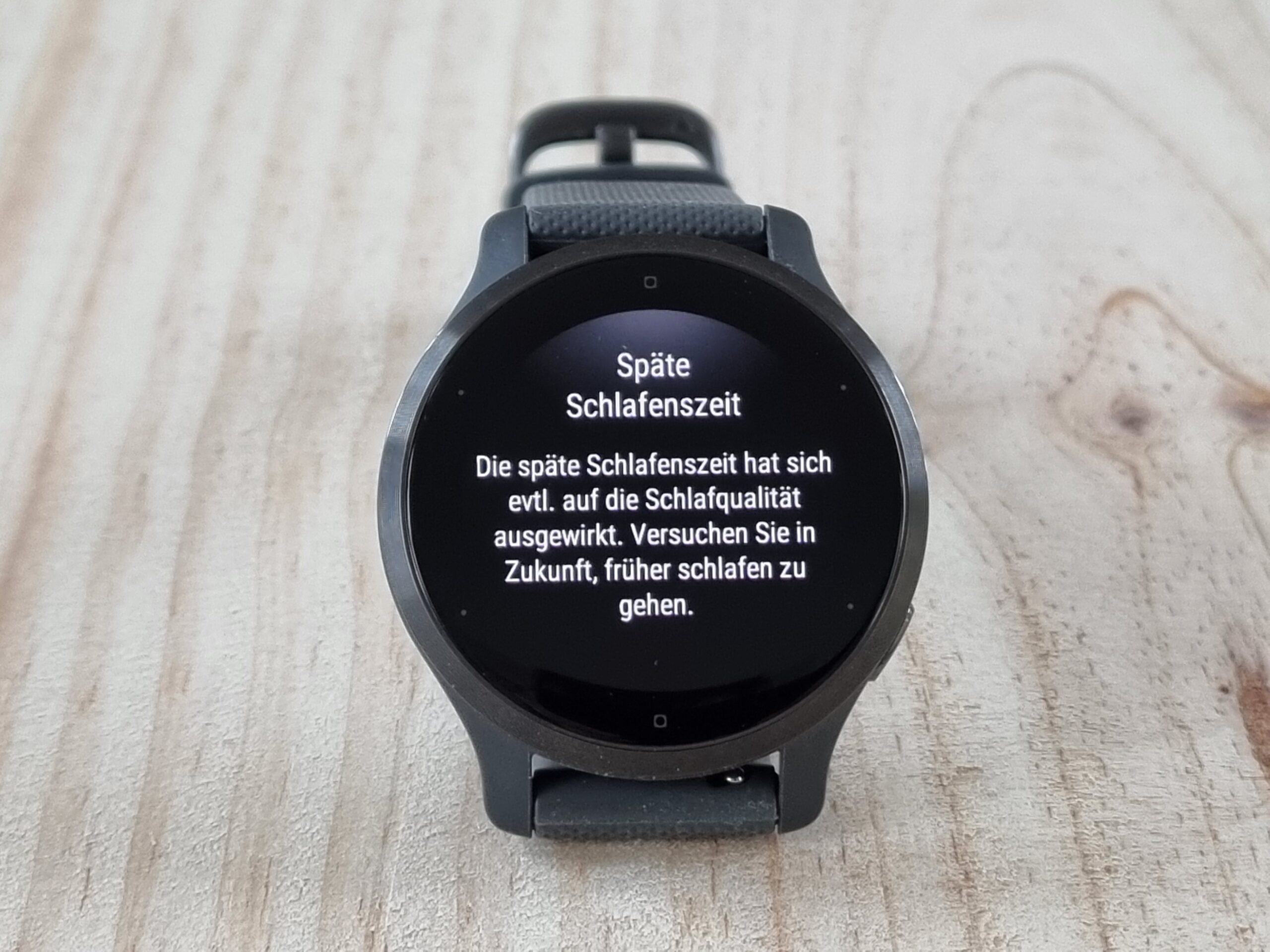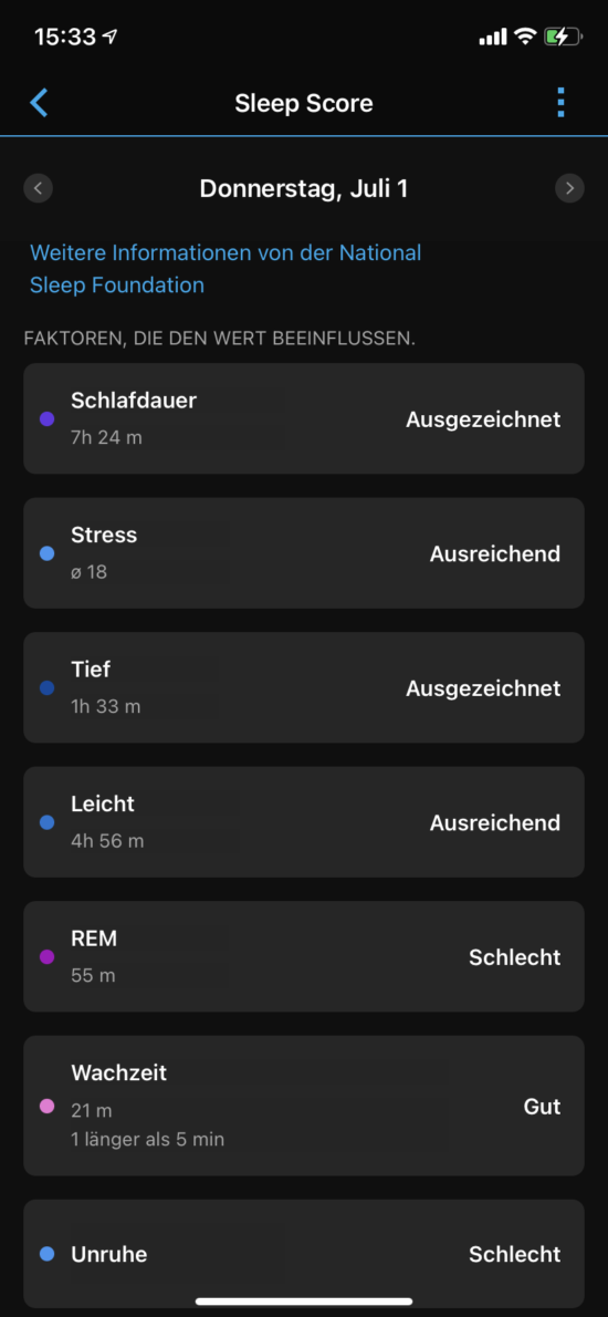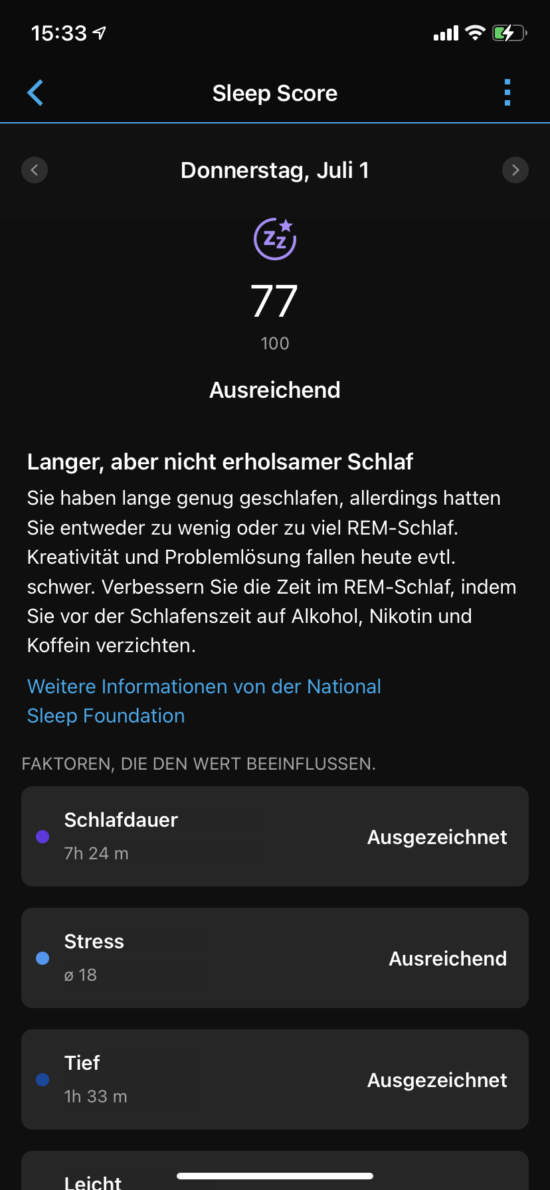 Der sogenannte Sleep Score erfolgt als kurze Schalfbewertung auf der Uhr wie hier: „Unausgewogener Schlaf. Sie haben weniger geschlafen als empfohlen, und die Qualität war insgesamt niedrig. Evtl. fühlen Sie sich heute nicht gut erholt.“ oder „Langer und erholsamer REM-Schlaf. Obwohl Sie spät schlafen gegangen sind, haben Sie gut geschlafen. Versuchen Sie in Zukunft, früher schalfen zu gehen.“ Die Schlafbewertungen lassen sich ebenso als ausführliche Information zusammen mit Tipps für eine gute Nachtruhe, einen besseren Tiefschlafs, zum Reduzieren des Schlafenszeitstresses u. v. m. in der Garmin Connect App bzw. der Webversion einsehen.