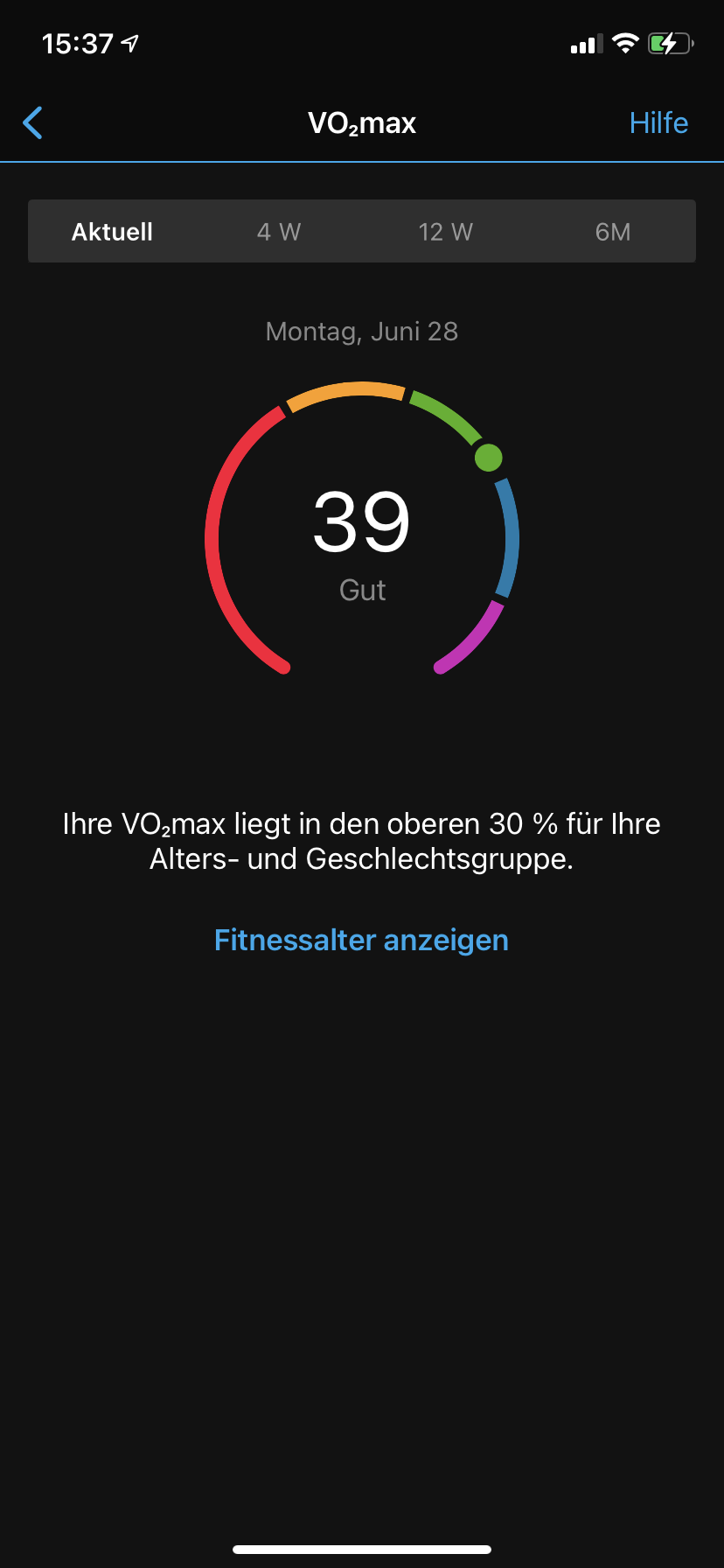 Die Coros-App bietet ebenfalls sehr gute Analyse-Möglichkeiten zu den persönlichen getrackten Daten sowie Fitnessaktivitäten. Dabei sieht sie der Garmin Connect-App äußerst ähnlich (wie auf den Bildern zu sehen). Besonders anschaulich, selbsterklärend und nützlich sind neben Statistiken zur Trainingsbelastung (7-Tage-Belastung) und zum Fitnesslevel (Grundfitness-Trend), ebenfalls der Lauflevel-Trend oder die 4-wöchige-Intensitätsverteilung. Man erhält den Verlauf und alle einzelnen Werte zu VO2max, Ruheherzfrequenz, Schwellengeschwindigkeit und Schwellenherzfrequenz. Die Werte sind beim Querhalten des Smartphones einsehbar: