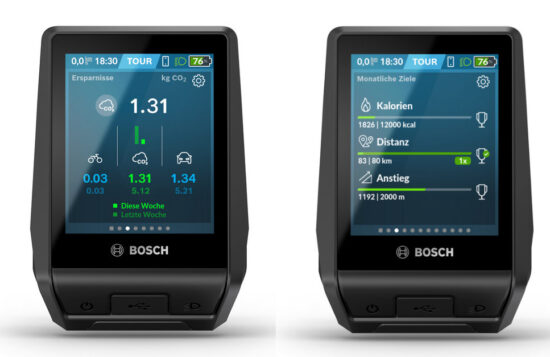 Neu beim Bosch Nyon2: CO2-Vergleich mit KFZ (links) und Fitness-Trainer (rechts, beide Bilder: Bosch)