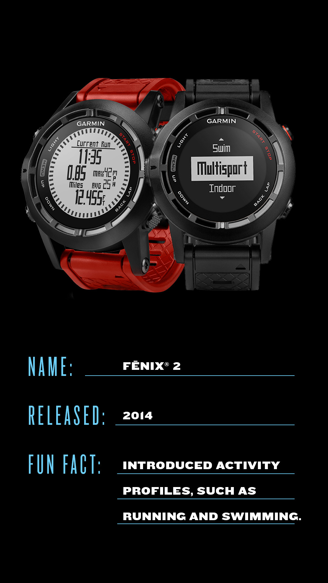 2014 wurde es dann endlich Zeit für den Nachfolger der fenix: Bereits die zweite Version der fenix-Serie fokussierte sich zusehends auf Sportfunktionen für Läufer, Wanderer und Radfahrer. Aber auch Schwimm- und Ski-Aktivitäten konnten nun mit der fenix 2 aufgezeichnet werden. Navigationsfeatures standen nun nicht mehr allein im Fokus der Entwickler.