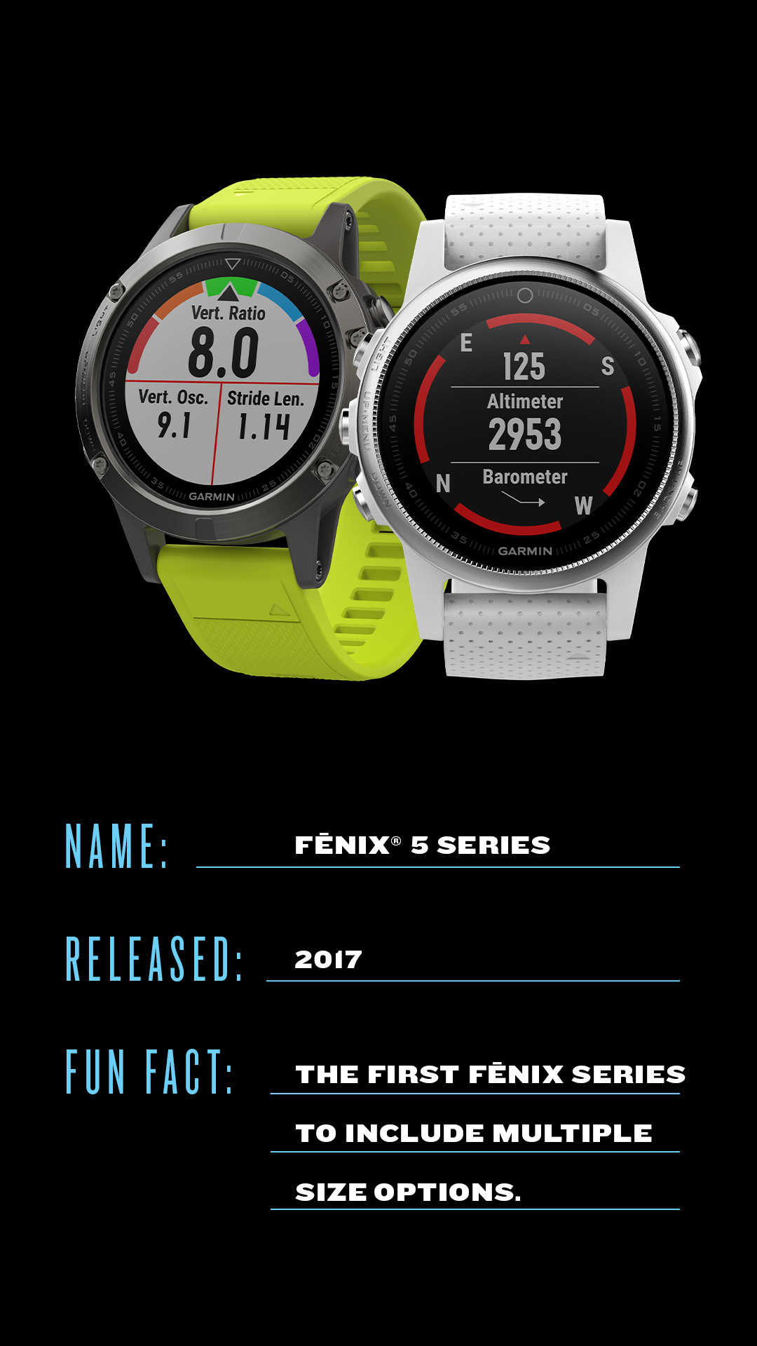 Da die fenix bisher eine eher recht imposante Erscheinung bot und für Frauen eher weniger attraktiv war, entschloss sich Garmin 2017 seine neueste Smartwatch in drei verschiedenen Größen anzubieten. Dabei verschlankte Garmin das größere Modell von 51 Millimeter auf 47 Millimeter, die kleinste Variante maß sogar nur 42 Millimeter.