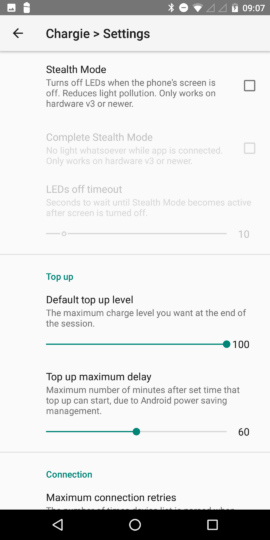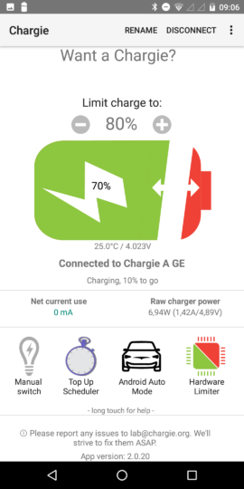Der Hardware-Limiter macht vor allem bei Geräten Sinn, die nicht per Bluetooth den Ladezustand an die App übertragen können. Damit der Chargie die Ladung vorzeitig beenden kann, ohne auf eine App angewiesen zu sein, muss vorab über die App der Hardware-Limiter aktiviert werden. Dabei können zwei Parameter eingegeben werden: