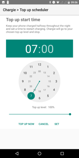 Schließt man z. B. sein Smartphones Abends ans Netzteil, würde es normalerweise direkt bis 100 % laden und dann die ganze Nacht über auf einem eher schädlich hohen Ladungszustand verbleiben. Nutzt man Chargie mit Top Up-Funktion, kann man etwa einstellen, dass das Smartphone um 6 Uhr mit der Ladung auf 100 Prozent beginnen soll, so dass es dann mit Verlassen des Hauses um 8 Uhr vollgeladen ist. Dem Smartphone bleibt dann der unnötig hohe Ladestand in der Nacht erspart. Der Akku wurde geschont, ohne dass man auf die volle Kapazität verzichten musste.