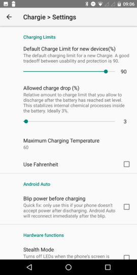 Chargie ermittelt die Temperatur des Smartphone-Akkus und kann die Ladung beenden, wenn eine eingestellte Temperatur überschritten wird. Der Akku wird so vor schädlichen hohen Temperaturen geschützt. Zwar ist ein solcher Schutz durch das Smartphone selber vorhanden, allerdings wird vom Smartphone erst die Ladung verweigert, wenn die Temperaturen wirklich extrem sind. Mit Chargie kann man somit selbst festlegen, bei welcher Temperatur man den Akku lieber nicht mehr laden möchte.