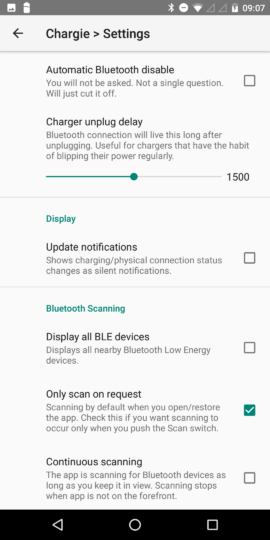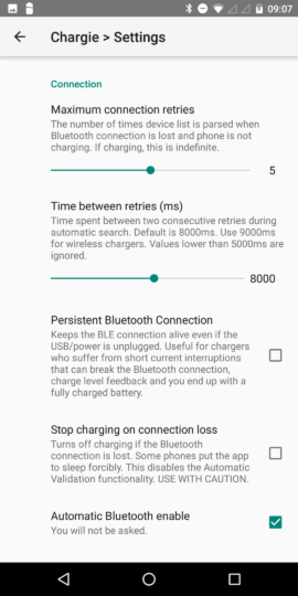 - Power re.measure interval: Hier kann man eine Zeit in Minuten/Stunden angeben, in denen der Chargie die Ladung wieder beginnt, um zu messen, welche Ladeleistung das Gerät zieht und ob diese Ladeleistung (+1 Watt) wieder über dem Low power cutoff threshold liegt. Ist das der Fall, wird geladen, ist das nicht der Fall, wird die Messung beendet und der Ladevorgang nicht gestartet.