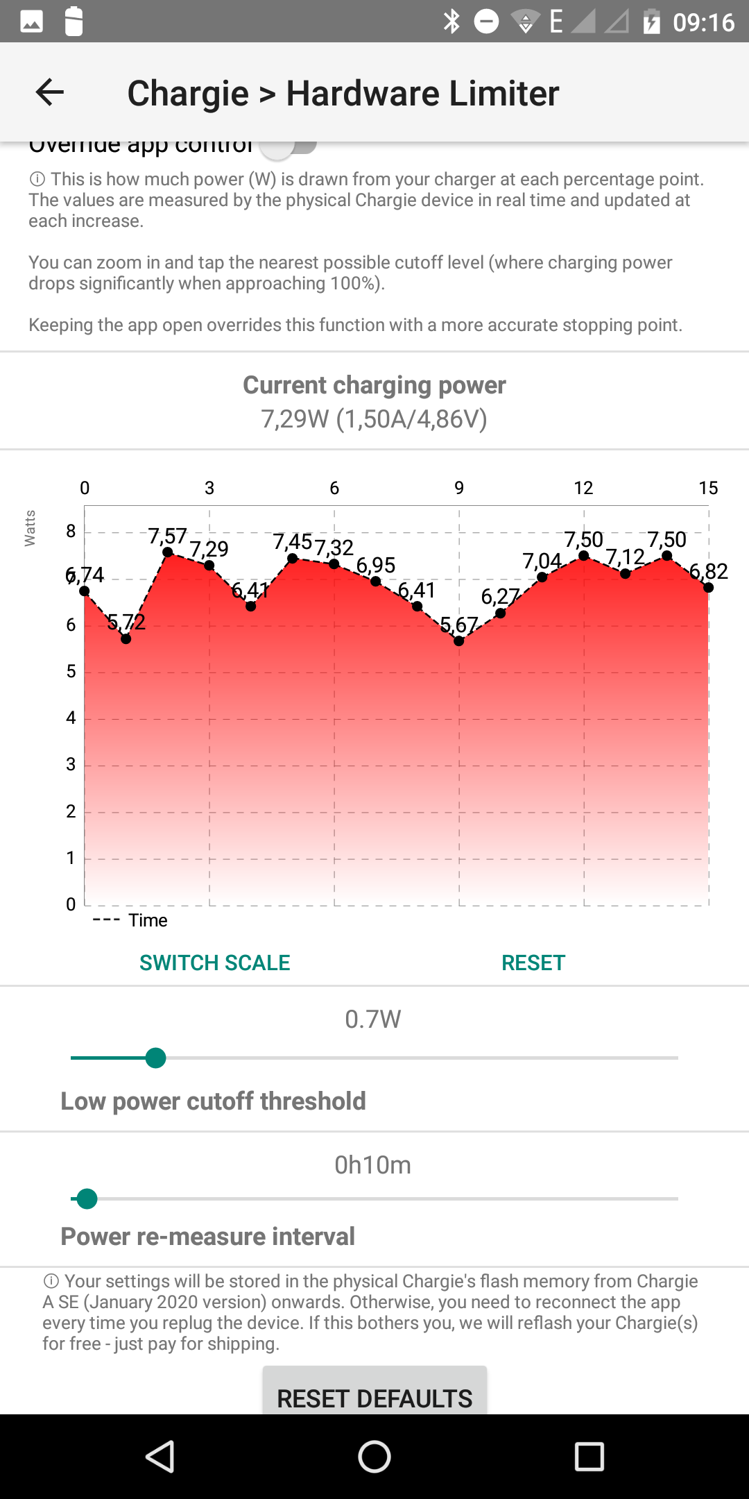 Leider bietet der Hardware-Limiter keine Möglichkeit, den Ladestrom / die Ladeleistung allgemein in der App aufzuzeichnen und als Diagramm darzustellen. Eine solche Darstellung ist nur für das Gerät möglich, auf dem die App läuft. Ein entsprechendes Diagramm wäre sehr hilfreich, um für angeschlossene Geräte die passenden Werte für den Low power cutoff threshold zu ermitteln. Immerhin werden die aktuelle Ladeleistung, der aktuelle Ladestrom und die aktuelle Ladespannung angezeigt, sodass sich hier auch ohne zusätzliches Messgerät der passende cutoff threshold ermitteln lässt.