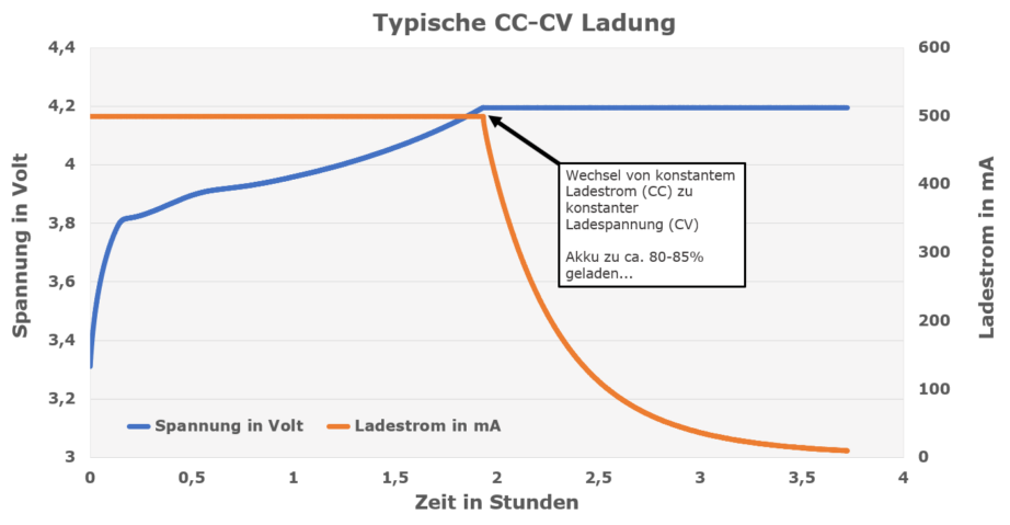 Lithium-Ionen-Akkus werden nach dem Prinzip CC-CV (Constant-Current-Constant-Voltage) geladen. Hat der Akku z. B. eine Ladeschlussspannung von 4,2 Volt, so wird in der ersten Phase mit einem festen und begrenzten Strom geladen, bis der Akku die Ladeschlussspannung von 4,2 Volt erreicht hat. In der Regel ist mit Erreichen der Ladeschlussspannung bereits ca. 80 Prozent der Kapazität eingeladen. Dieser Teil der Kapazität wird mit einem hohen Strom und damit auch entsprechend schnell geladen.