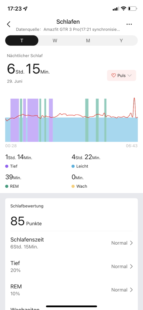 Etwas umständlich ist es, wenn man eine Schlafaufzeichnung von vor 5 Monaten sucht: Es gibt zwar eine Jahres-, Monats-, Wochen- und Tagesansicht, doch kommt man aus der Monatsansicht nicht auf die Tagesansicht, obwohl die durchschnittliche Schlafdauer für den Tag auffrufbar ist. Es wäre also nur einen Klick entfernt, aber es tut sich nichts, wenn man auf den Tag klickt. Man muss oben in der Leiste auf „T“ klicken und Tag für Tag zurückwischen. Hier müsste Amazfit noch nachbessern. Ansonsten gefällt uns die Aufbereitung der Daten sehr gut.