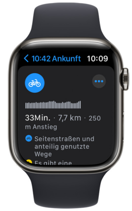 Die Fahrradrouten-Funktionen werden auch auf der Apple Watch unterstützt, so wird z.B. auch die Sprachausgabe sowie das Voice Feeback zur Geschwindigkeit und Entfernung über den eingebauten Lautsprecher der Uhr wiedergegeben.