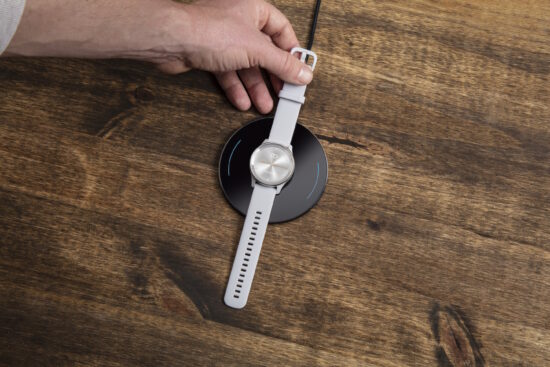 Die drahtlose Ladefunktion der vivomove Trend hat die Ladeklemme nicht endgültig ersetzt. Nutzer können sich weiterhin entscheiden, ob sie wohlbekannt über die Ladeklemme oder ganz modern via Qi-Ladematte Energie tanken. Garmin gibt an, dass die neue wirelessfähige Smartwatch mit den meisten Qi-zertifizierten Ladematten kompatibel ist.