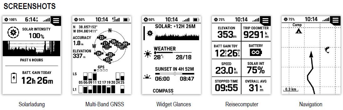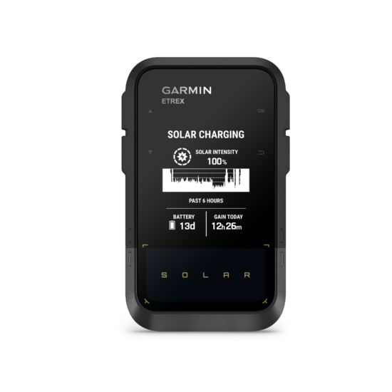 Das neue Gerät ist, von der Solarfunktion abgesehen, weitgehend identisch mit dem eTrex SE und bietet ein 2,2 Zoll großes transflektives MIP Display, welches auch im direkten Sonnenlicht optimal abzulesen ist. Darüber hinaus kommt die neuste GNSS Multi-Frequenz Empfangstechnologie zum Einsatz, was eine schnelle und genaue Positionsermittlung garantiert. Die eTrex Serie ist nach IPX7 wasserdicht und bietet Bluetooth Konnektivität und einen USB-C Anschluss.