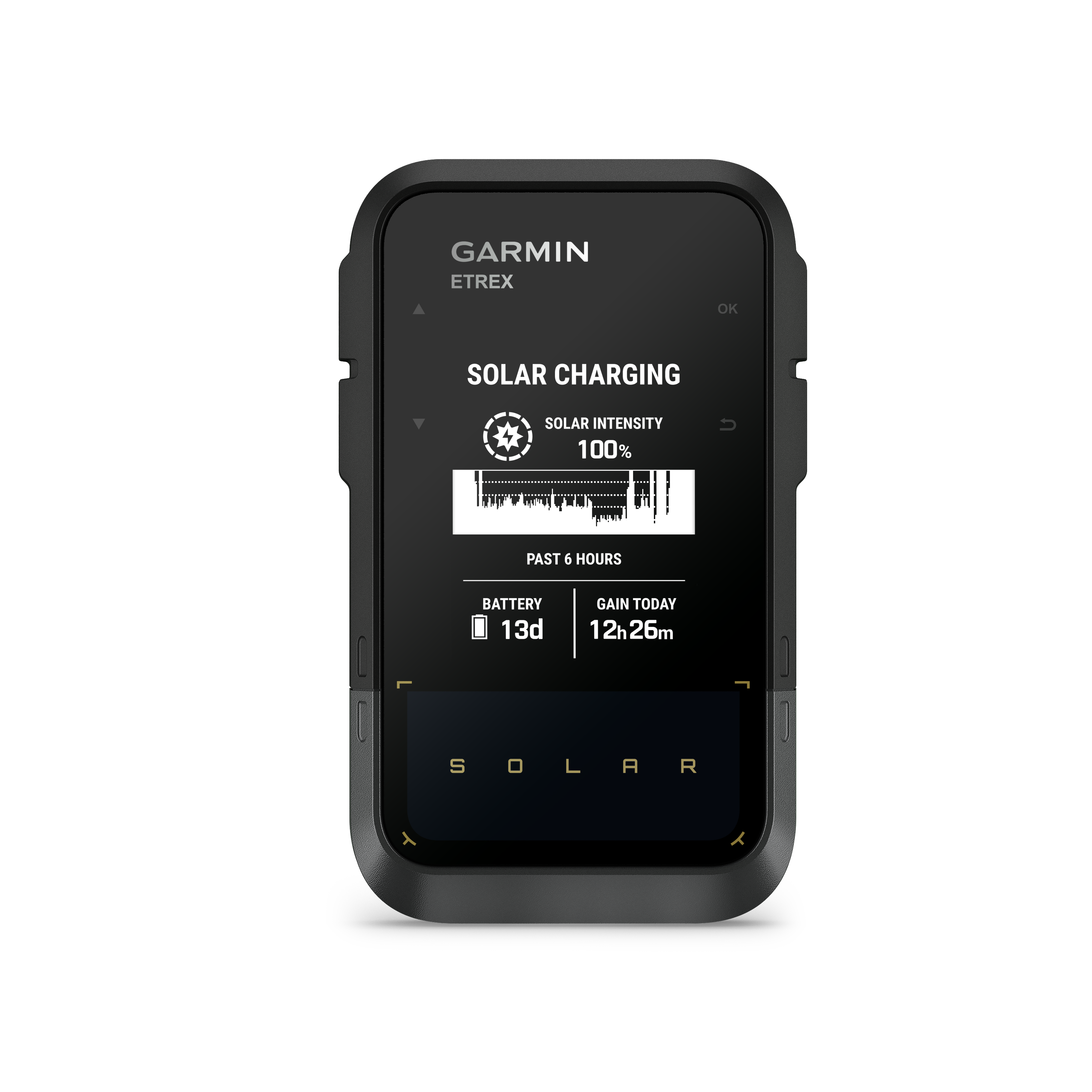 Das neue eTrex Solar hat einen festverbauten Lithium-Ionen Akku erhalten und ist damit ca. 15 Gramm leichter als das eTrex SE mit eingelegten Akkus. Das unter dem Display integrierte Solarmodul soll dem Gerät eine unbegrenzte Laufzeit (bei 75.000 LUX) ermöglichen. Viele Solarprodukte von Garmin verwenden das sog. Powerglass, welches den Vorteil hat, die gesamte Displayfläche für die Energieerzeugung zu verwenden. Der Nachteil ist jedoch, dass das Display durch das Powerglass leicht abgedunkelt wird und etwas weniger Kontrast bietet. Das eTrex Solar hingegen verwendet das normale Displayglas und bietet daher die gleichen hervorragenden Display Eigenschaften wie das eTrex SE.