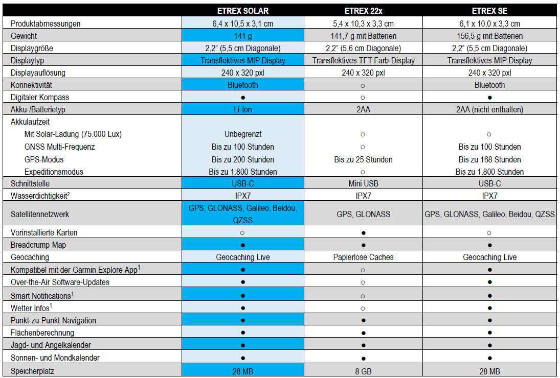 Vergleichstabelle Garmin eTrex SE, eTrex Solar, eTrex 22x