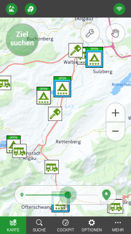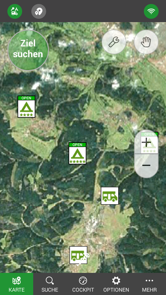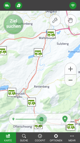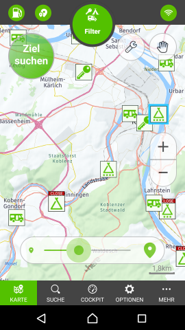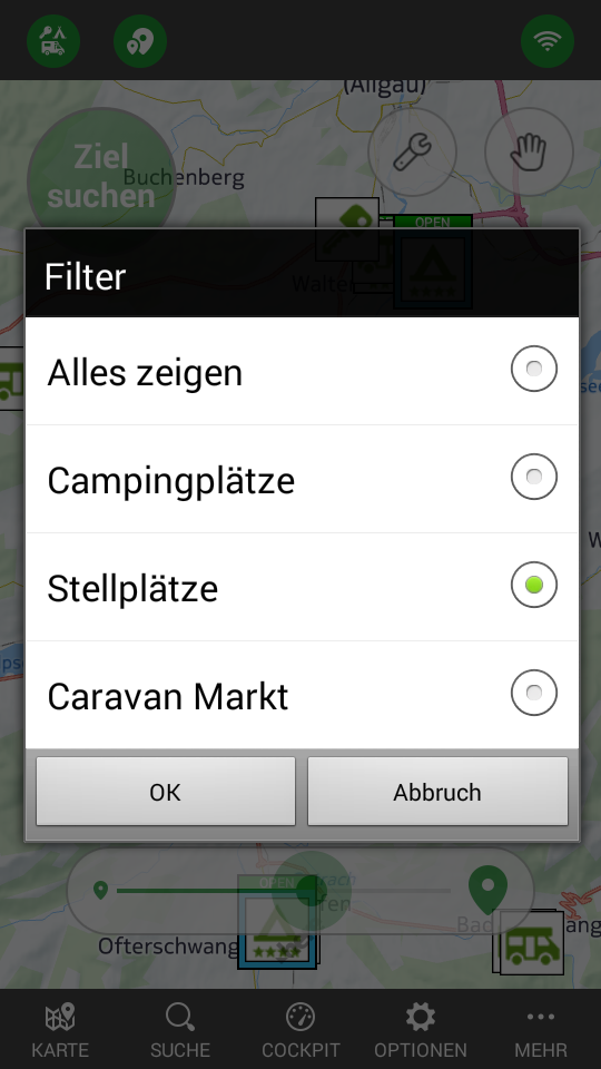 Durch die Auswahl können entweder Campingplätze, Stellplätze oder der Caravan Markt sowie alle drei Kategorien gleichzeitig auf der Karte angezeigt werden.