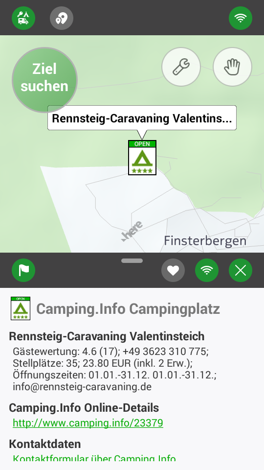 Die grün unterlegten Texte in der POI-Detail anzeige sind klickbar und führen die jeweilige Aktion aus: Telefonanruf, Browser, E-Mail.