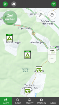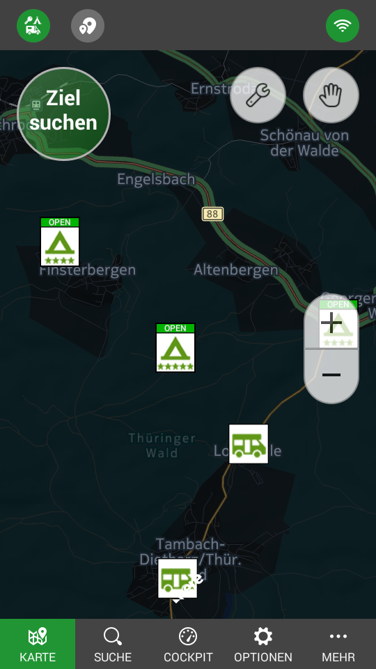 Camping Navi by POIbase startet in der Kartenansicht. Zunächst ist es sinnvoll die Größe der POI Icons an die persönlichen Bedürfnisse anzupassen, da diese Einstellung auch in die Cockpitansicht übernommen wird.