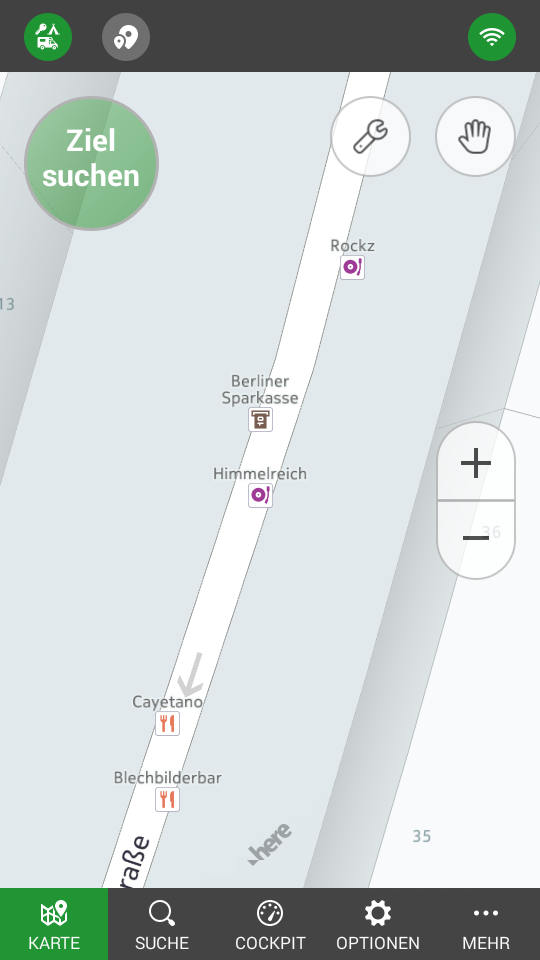 Durch die zusätzlichen Daten von HERE Maps werden weitere Orte wie Restaurants, Banken, Clubs, Tankstellen und andere mit den jeweiligen Symbolen auf der Karte verortet.