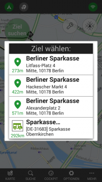 Das gefundene Ziel wird anschließend auf der Karte markiert. Antippen des Ziel-Icons ermöglicht: 1. Route vom aktuellen Standort zum Ziel auf der Karte anzuzeigen, 2. vom aktuellen Standort zum Ziel im Cockpitmodus zu navigieren oder 3. das Ziel an eine externe Navi-App zu übergeben.