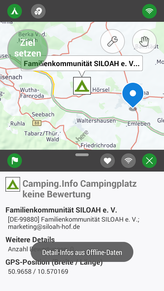 Die Funktion Offline-Kartenmodus ermöglicht die Offline-Verfügbarkeit des Kartenmaterials. Dadurch ist ein mobiles Nachladen der Kartendaten nicht mehr erforderlich. Dies spart erheblichen Traffic und bedeutet eine deutlich bessere Performance ohne Wartezeiten beim Laden der Karte. Die Funktion wird durch einen Klick auf das grüne Offline-Icon aktiviert.
