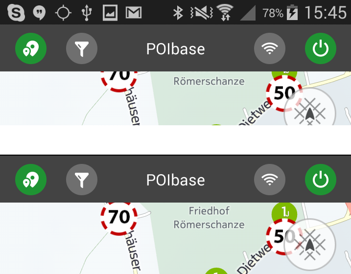 Blendet die obere Android Statusleiste ein bzw. aus. Das Ausblenden spart Platz und ist daher voreingestellt.