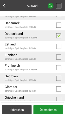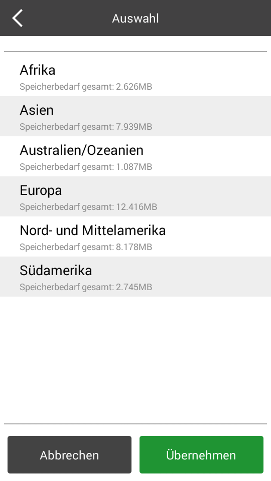 Hier können die offline-Karten heruntergeladen werden. Zur Auswahl stehen die Kontinente Afrika, Asien, Australien/ Ozeanien, Europa sowie Nord-/Mittel- und Südamerika. Zu jedem Kontinent können die dazugehörigen und verfügbaren Länder einzeln ausgewählt und heruntergeladen werden. Der benötigte Speicherbedarf wird dabei jeweils unter der Bezeichnung angezeigt.
