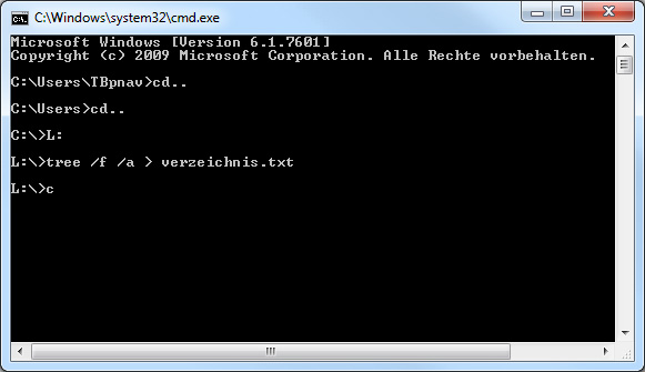- Nun kann der eigentliche Befehl ausgeführt werden: tree /f /a > verzeichnis.txt dieser Befehl wird durch Drücken der Enter-Taste ausgeführt (bitte die Leerzeichen hinter tree, hinter f, hinter a und hinter > beachten).