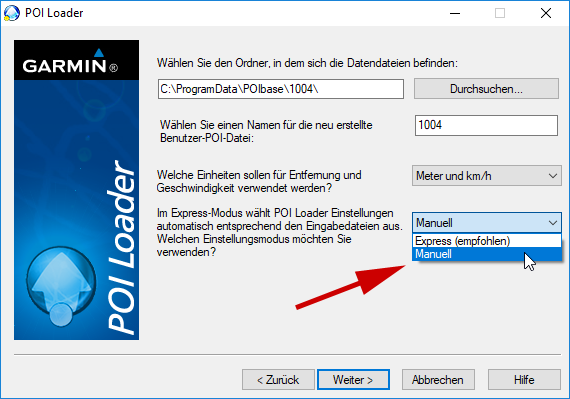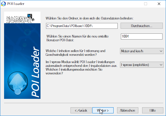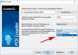 Wähle einen Namen z.B. Poi und den Express-Modus und bestätige mit Weiter (der Pfad zu den POI-Daten sollte bereits eingetragen sein z.B. C:\ProgramData\POIbase\1097\). Der POI-Loader erstellt nun eine GPI-Datei mit dem ausgewählten Namen im ausgewählten Verzeichnis in diesem Beispiel  C:\User\POIbase. Diese Datei kann nun auf die Garmin Map Pilot SD-Karte in das Verzeichnis garmin\poi kopiert werden.