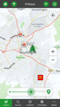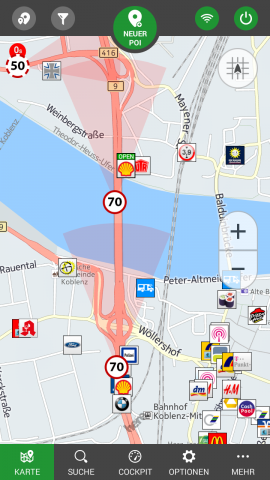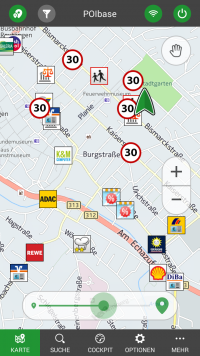 POIbase startet in der Kartenansicht. Zunächst ist es sinnvoll die Größe der POI- und Blitzer Icons an die persönlichen Bedürfnisse anzupassen, da diese Einstellung auch in die Cockpitansicht übernommen wird.