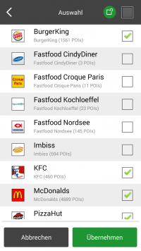 Filter aktivieren: Klick auf das graue Filter-Icon in der obene Menüleiste aktiviert die Filterauswahl. Nach Auswahl der Haupt- und Unterkategorie, können einzele POI-Kategorien über die Checkbox ausgewählt werden. Die Filterauswahl wird mit dem Button Übernehmen bestätigt, der Filter ist dann aktiv, was durch das grüne Filter-Icon in der oberen Menüleiste angezeigt wird.